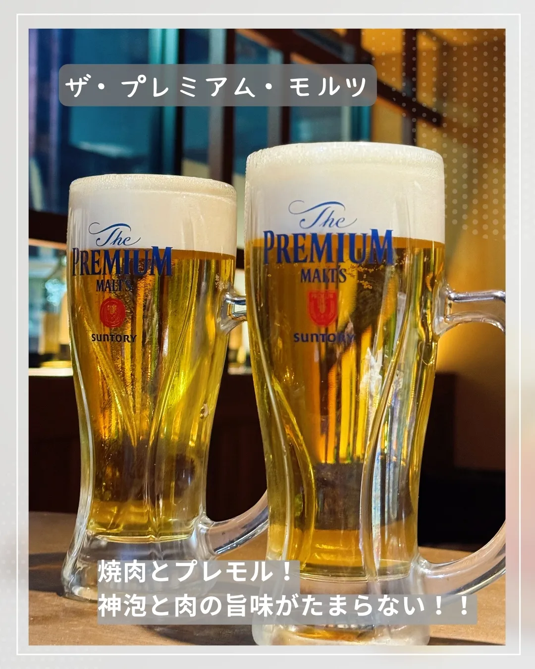 🎉焼肉ナイトをもっと特別に!🎉今日のおすすめドリンクは、サントリーのプレミアムモルツです🍻。焼肉といえば、やっぱりプレモルがベストマッチ!その理由は、神泡のクリーミーさと炭火で焼いたお肉のジューシーさが絶妙に絡み合うこと🌟。一口飲んでみれば、そのおいしさに納得するはず!特に、タレの甘辛さと神泡のコンビネーションが口の中で広がる瞬間は、至福のひととき😌。お友達やご家族と一緒に、この最高のペアリングをぜひお楽しみください!お待ちしております😊🍖🥩。
