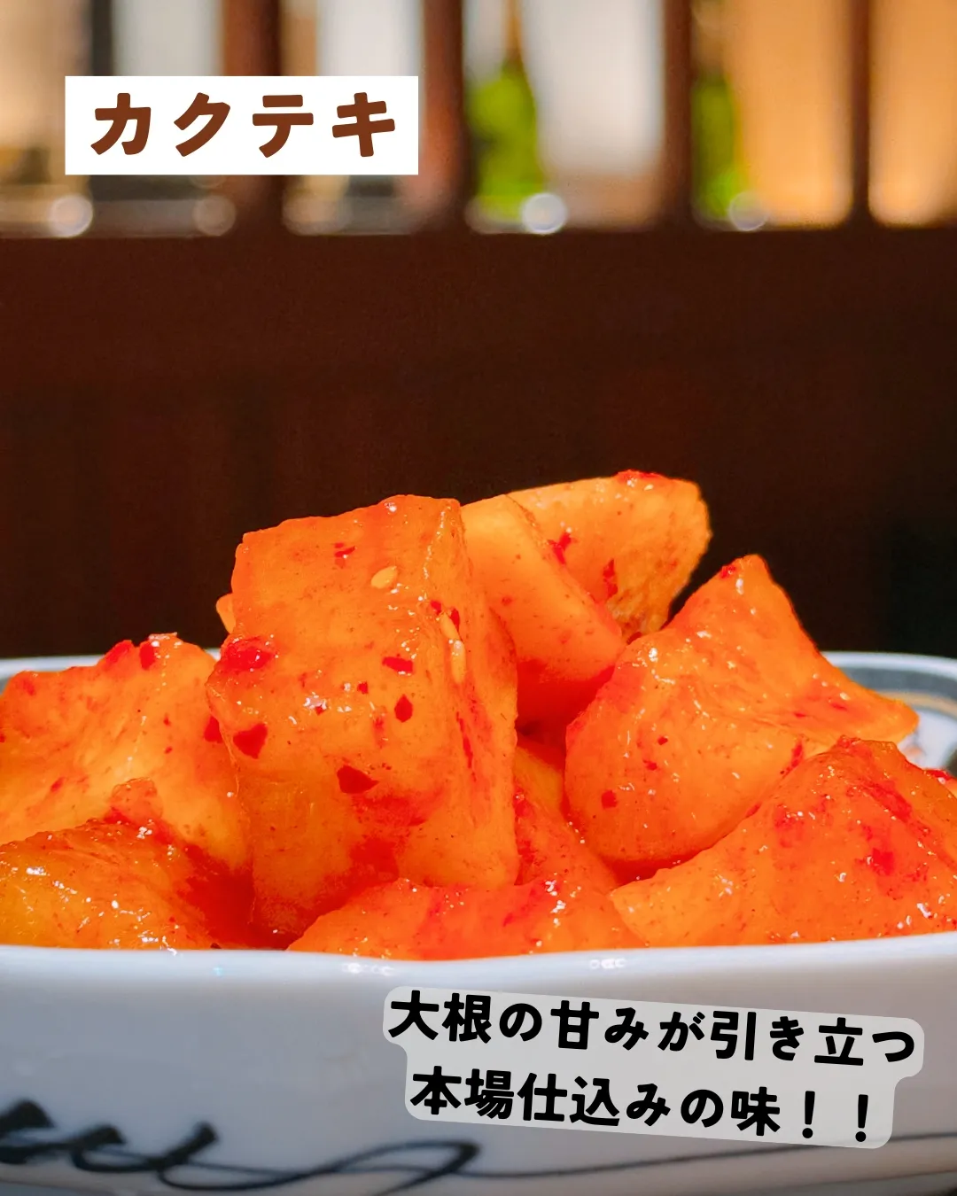 📢本日のイチオシメニューは、ピリッと辛くて食欲をそそる「カクテキ」!✨大根が持つ自然の甘みと、ピリ辛の味付けが絶妙にマッチしています🎯。この絶品カクテキは、白いご飯と一緒に食べると、箸が止まらなくなります🍚🔥。焼肉と共にお楽しみいただくことで、さらに会話が弾み、美味しさも倍増しますよ!🥢
